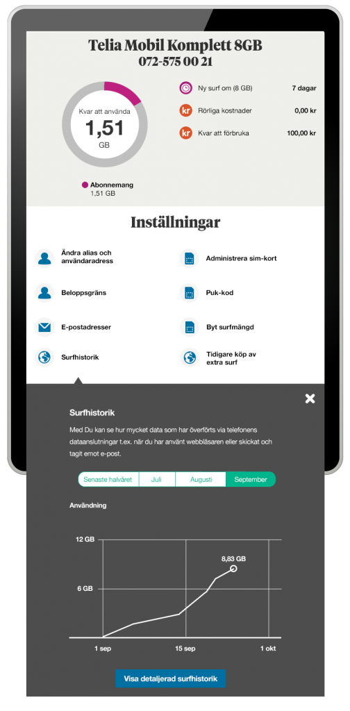 Mina sidor gav användaren möjlighet att logga in på telia.se för att se sina abonnemang, köpa till tjänster, se och följa sina ärenden och fakturor.