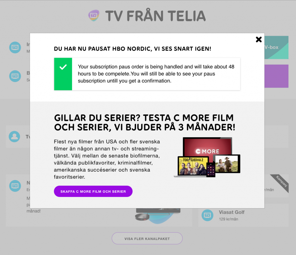 Den del vi gick vidare med, var att kunna säga upp en av tv-tjänsterna online. Här kan man kanske tillägga att om man köper tjänsten direkt från leverantören är det enkelt att säga upp den online. Och detta utan att ringa någon kundtjänst. Online kan vi inte erbjuda någon förmån eller liknande utan får helt förlita oss på innehåll och inspiration för att få kunden att stanna kvar.