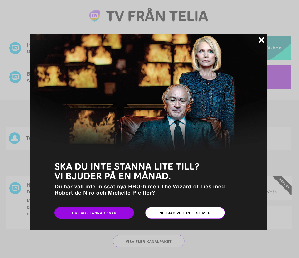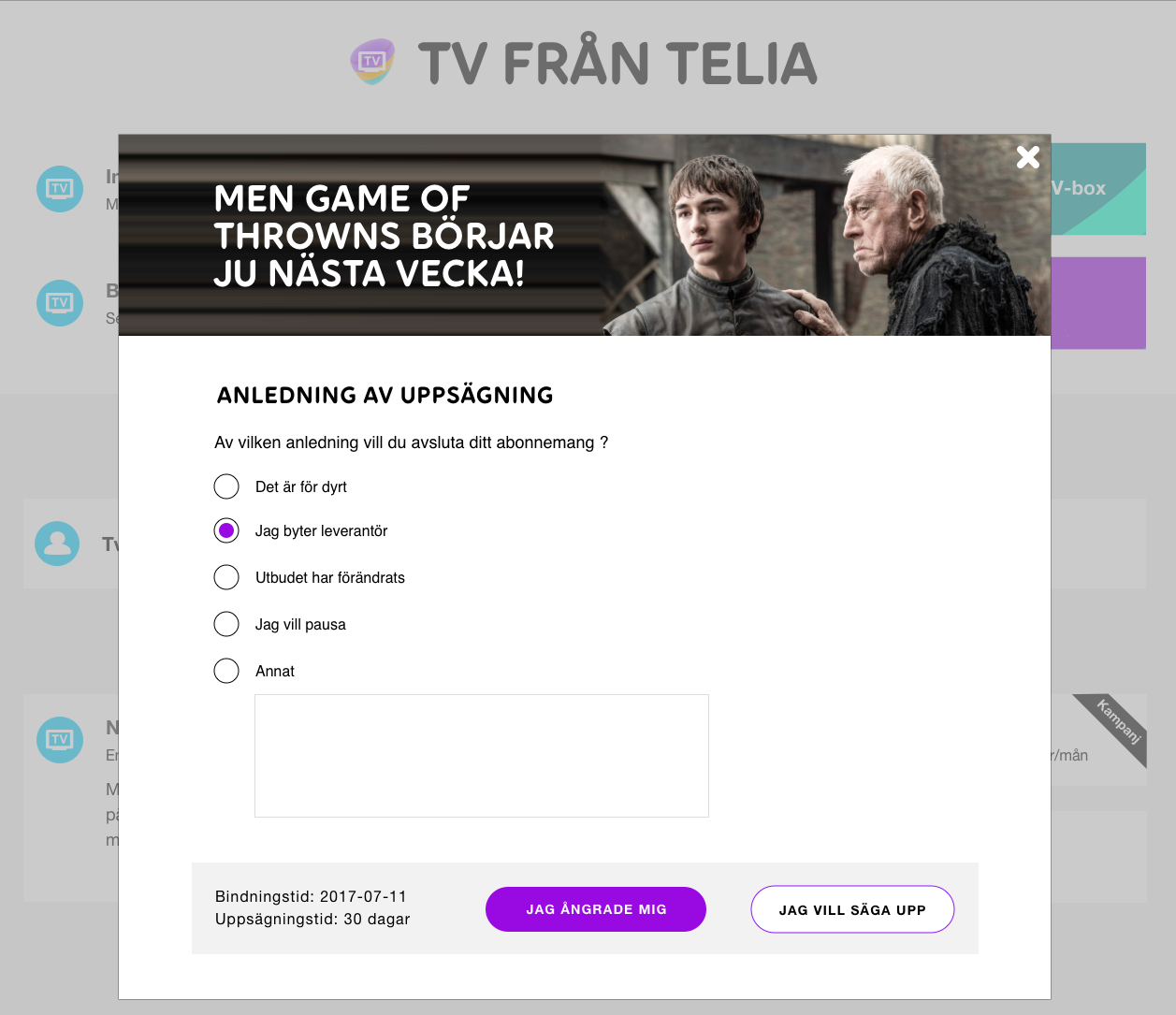 Den del vi gick vidare med, var att kunna säga upp en av tv-tjänsterna online. Här kan man kanske tillägga att om man köper tjänsten direkt från leverantören är det enkelt att säga upp den online. Och detta utan att ringa någon kundtjänst. Online kan vi inte erbjuda någon förmån eller liknande utan får helt förlita oss på innehåll och inspiration för att få kunden att stanna kvar.